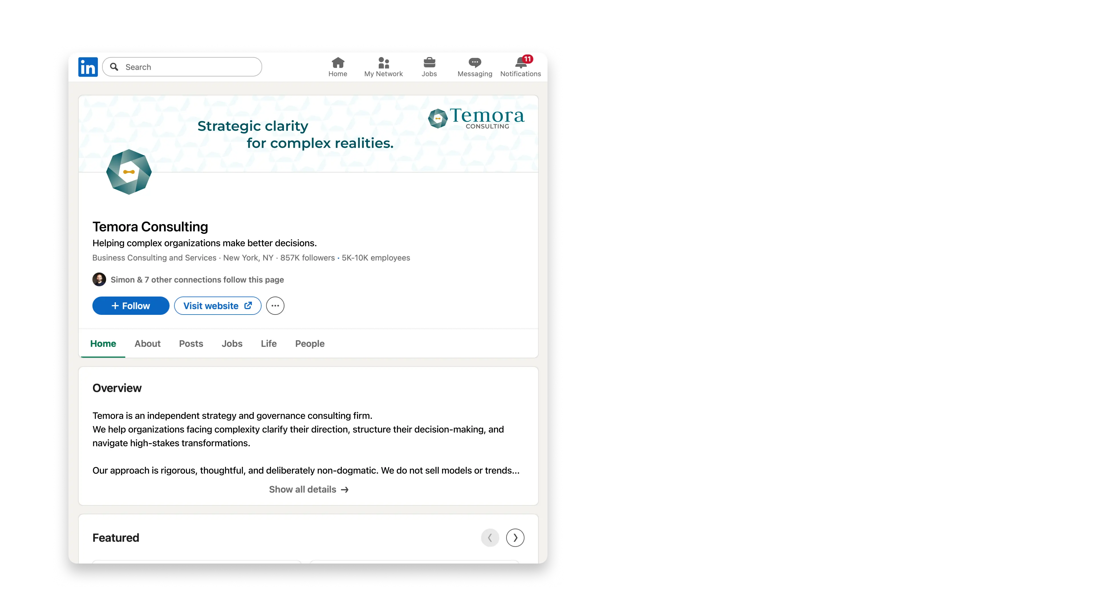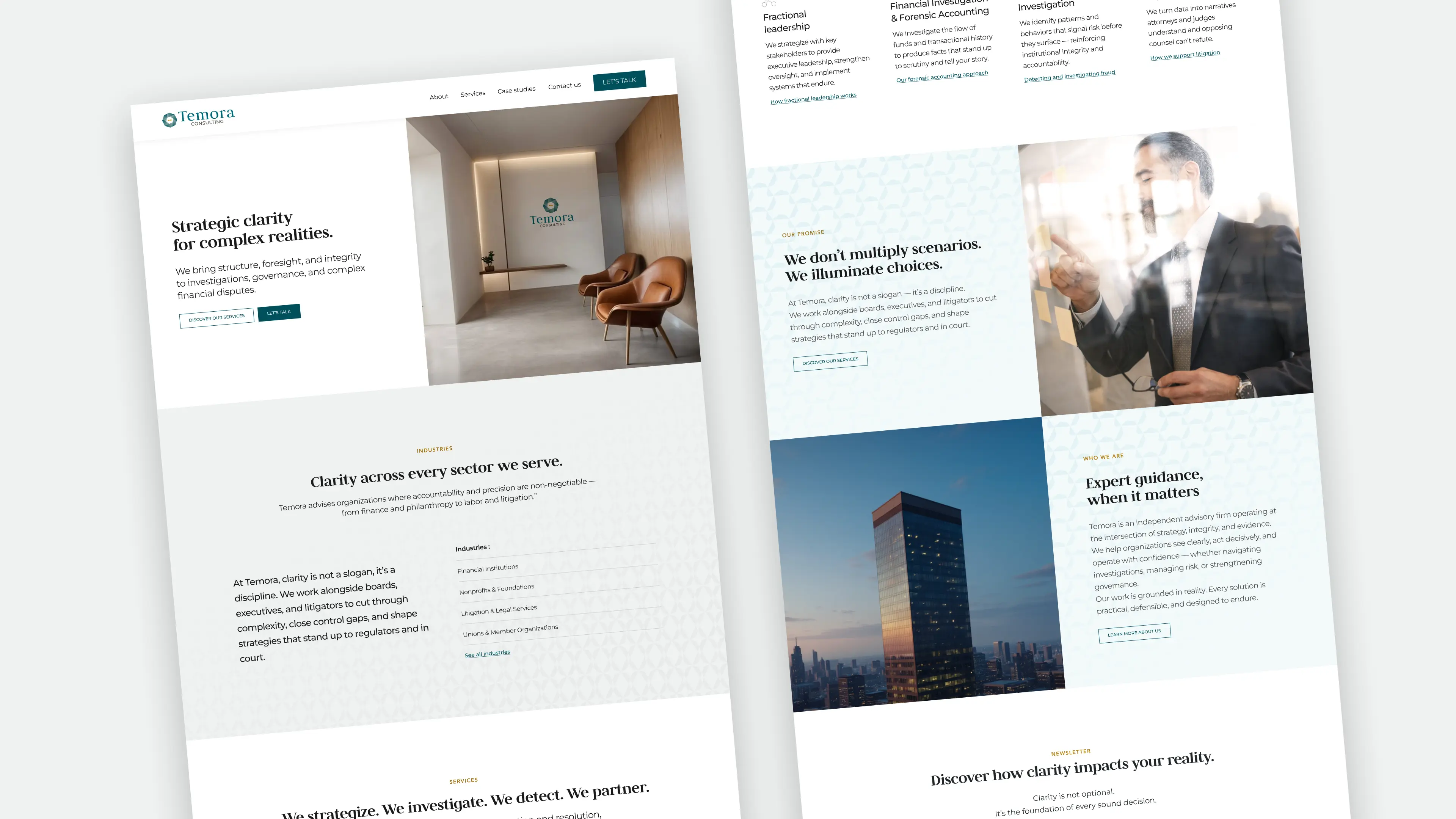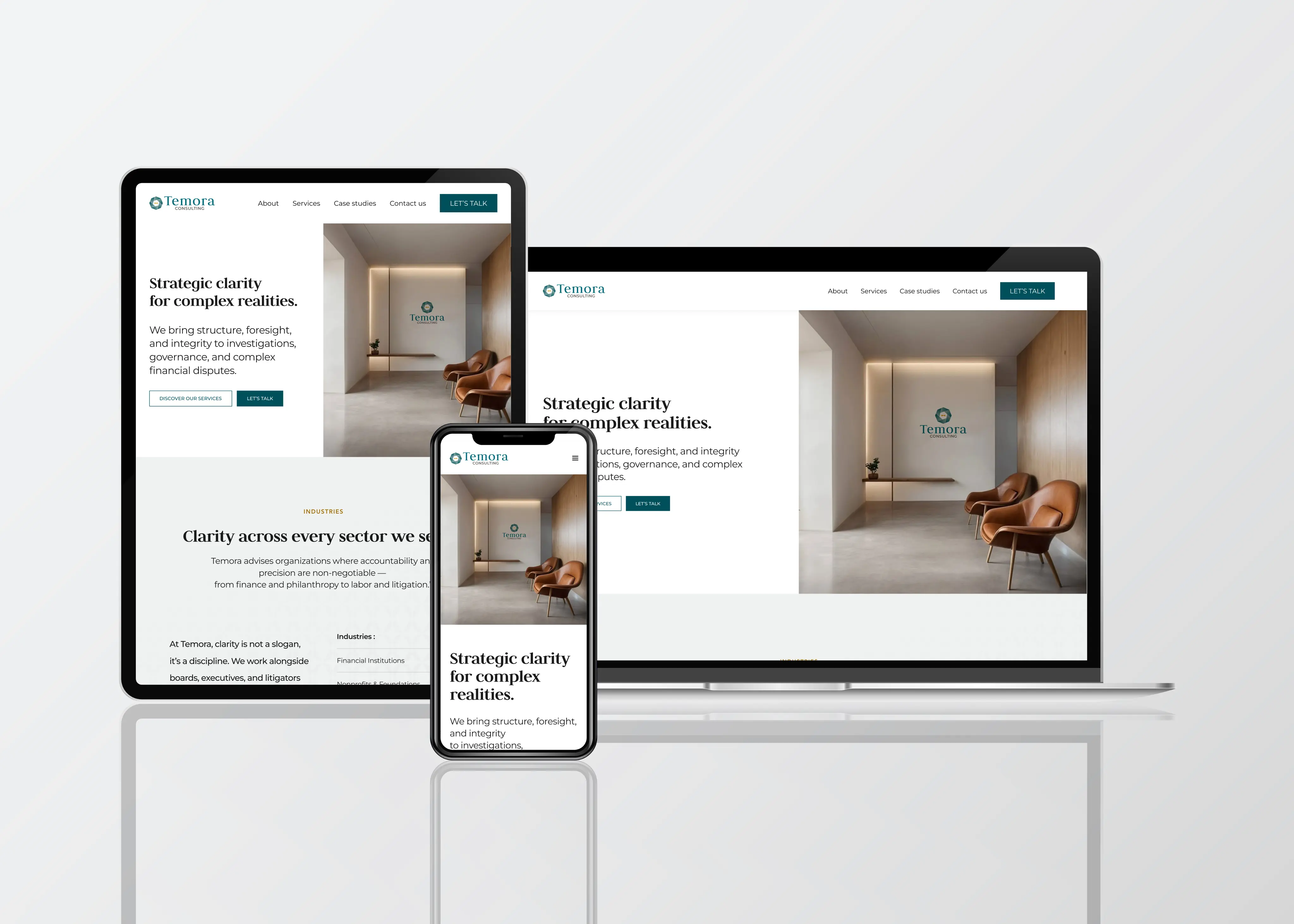 une structure géométrique qui évoque la mise en relation de perspectives multiples et leur synthèse. Il ne s’agit pas d’un signe décoratif, mais d’une traduction visuelle du travail de Temora — révéler des structures, clarifier des contradictions, permettre la décision.